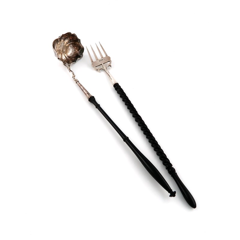lobed oval form, chased foliate decoration, engraved with a crest, turned wooden baluster handle, length 39cm, plus an Edwardian silver toasting fork, by Nathan and Hayes, Chester 1902, the wooden handle with swirl decoration, length 39.2cm. (2)