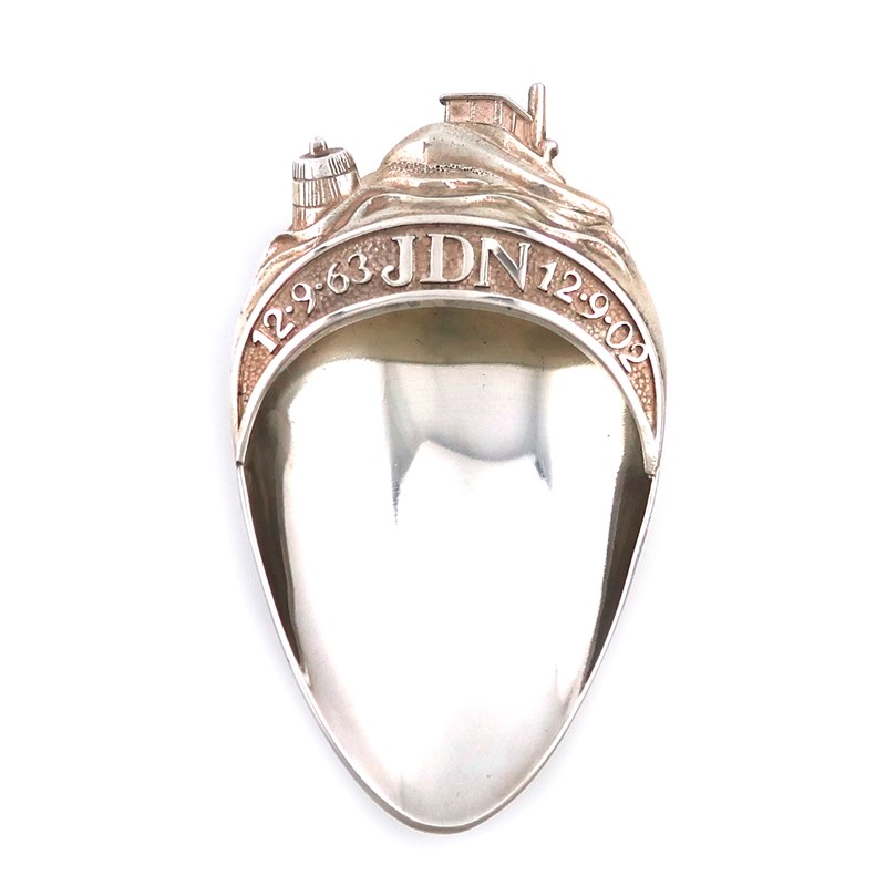 scoop form, plain oval bowl, chased '12-09-63 JDN 12-09-02', and with a boat and buoy, length 7.4cm, approx. weight 1oz.