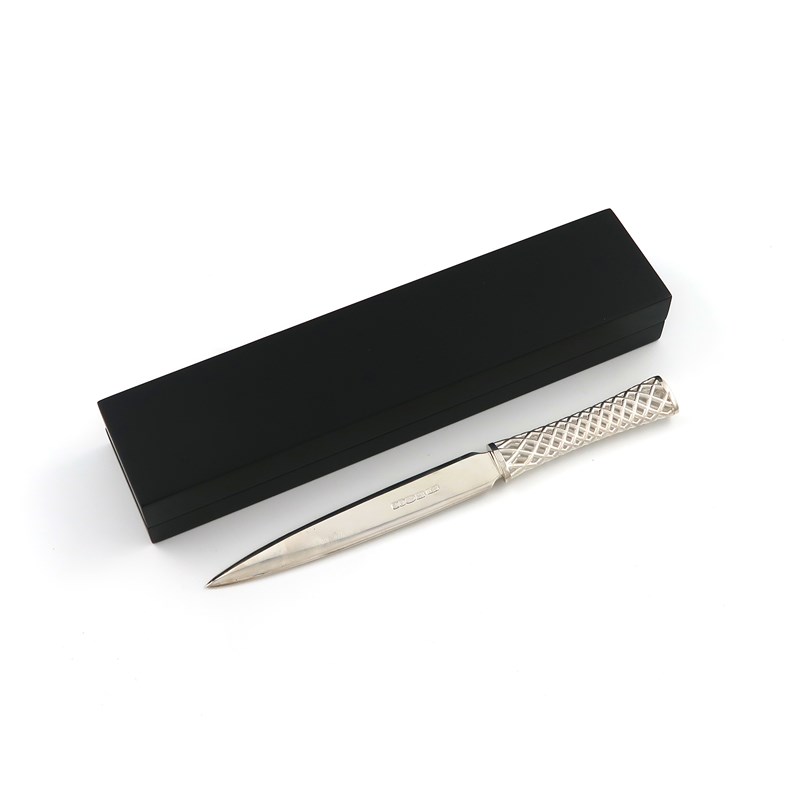 the handle with pierced trellis decoration, tapering blade, in a fitted box, length 21.8cm, approx. weight 3.6oz.