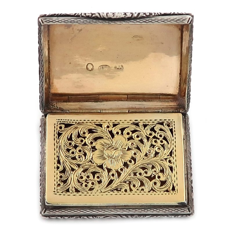 rectangular form, the hinged cover with a scene of the house, the interior with a pierced and engraved silver-gilt grille, engine-turned sides and base, foliate scroll border, the underside with a vacant cartouche length 4.7cm, approx. weight 1.5oz.