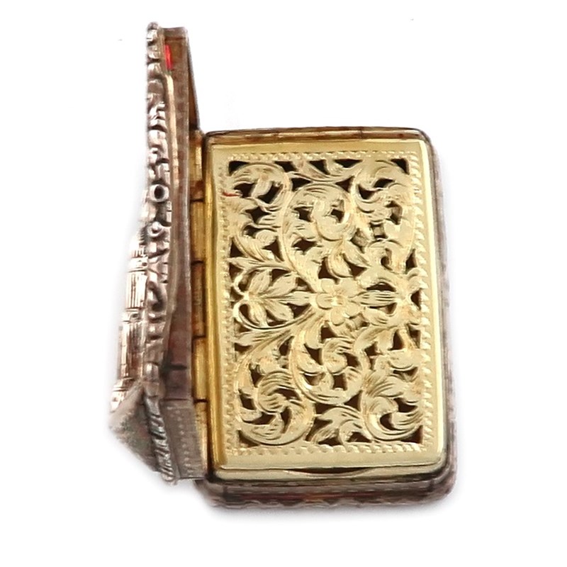 rectangular form, the hinged cover with a scene of the memorial, the interior with a pierced and engraved silver-gilt grille engine-turned sides and base, the underside with a vacant shield cartouche, length 4.2cm, approx. weight 0.9oz.
