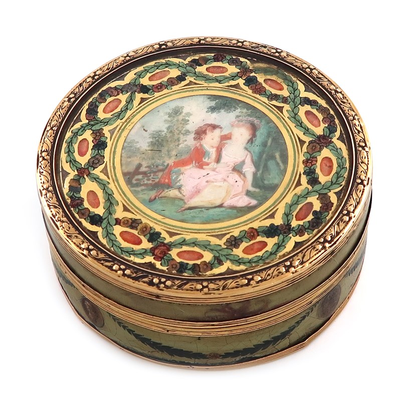circular form, the centre with a playful scene of a lady and gentleman with foliate borders under glass, the composition sides and base with classical scene, medallions and swags, tortoiseshell lined, diameter 7.8cm.