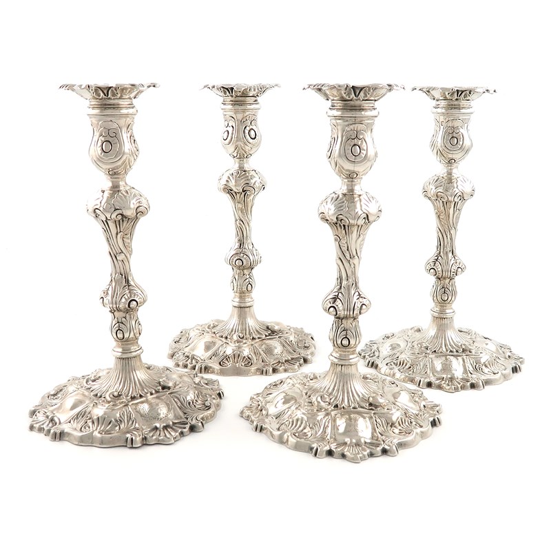 baluster columns, shell shoulders, urn shaped capitals, detachable unmarked drip pans, on spread circular bases with foliate and shell decoration, engraved with a crest and armorial, height 24.2cm, approx. weight 108oz. (4)