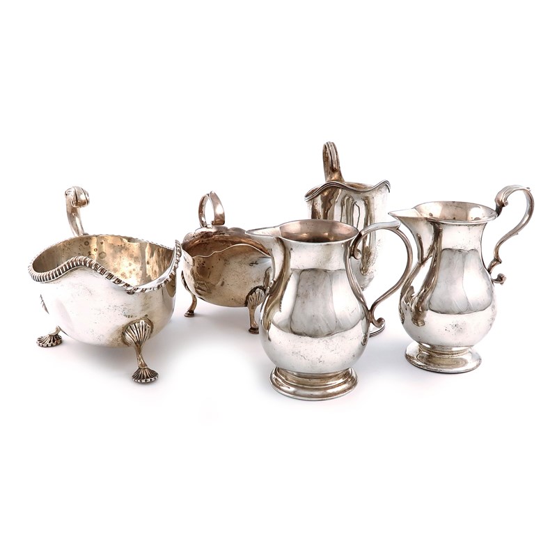 comprising: two cream jugs of 'sparrow-beak' form, London 1931 and 1901, a George III cream boat, by John Langlands, Newcastle 1774, plus a sauce boat and a cream jug, approx. weight 24oz. (5)