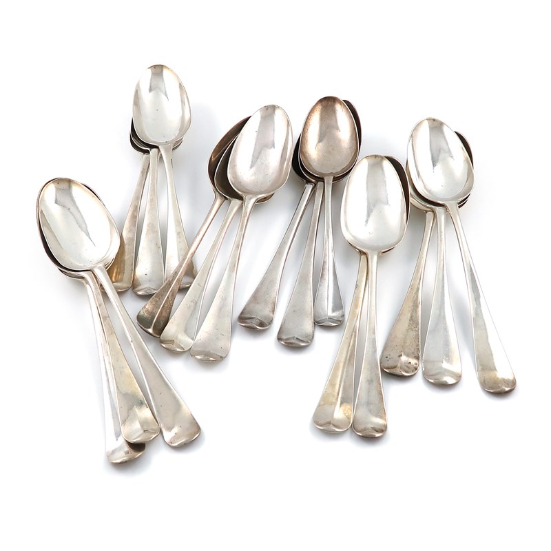 A collection of eighteen George II/III silver Hanoverian pattern tablespoons