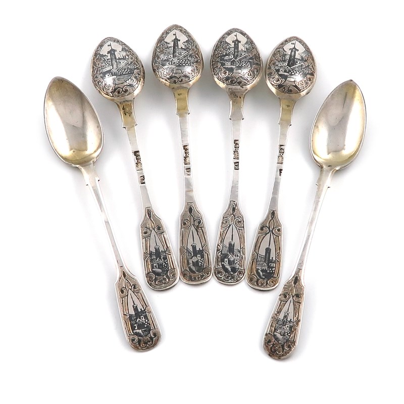 the reverse of the bowl and terminals with landscape scenes, with traces of gilding, approx. weight 2.5oz. (6)