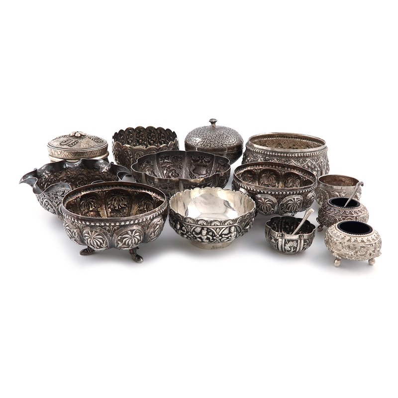 comprising: a bowl and cover with finely chased decoration, a betel nut box, a pair of salt cellars with snake salt spoons, two further salt cellars, and seven various bowls. (13)