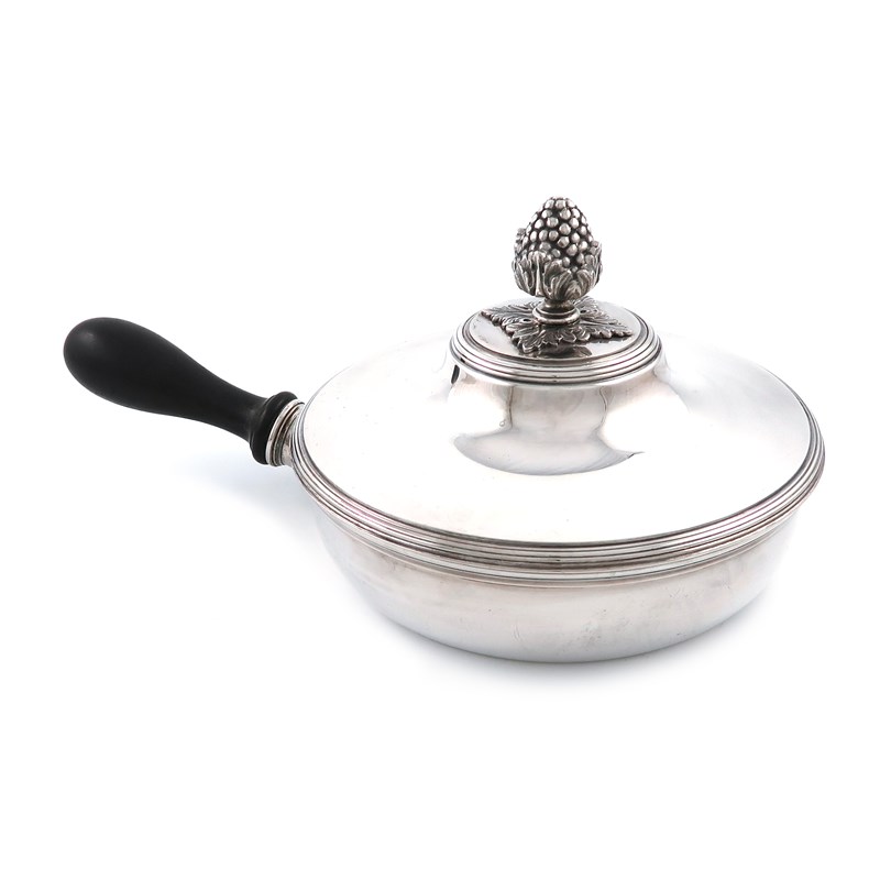 circular form, gilded interior, turned baluster wooden handle, the pull-off cover with a foliate cone finial, length 28.5cm, approx. weight 25oz.