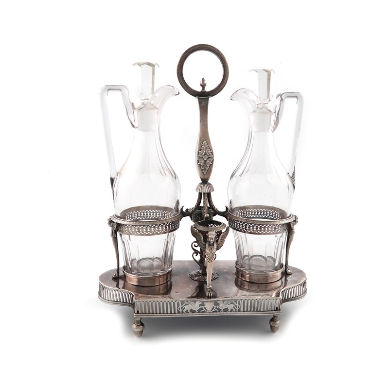A late 18th / early 19th century French silver two bottle oil and vinegar frame