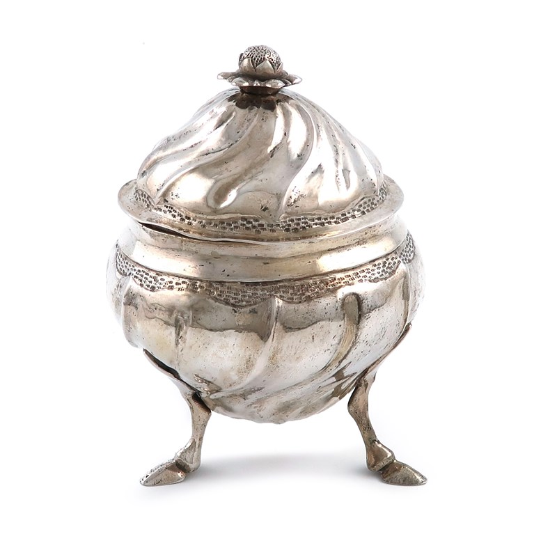 lobed baluster form, with a chased border of decoration, the lobed pull-off cover with a fluted finial, on three legs terminating in hoof feet, height 13cm, approx. weight 6.7oz.