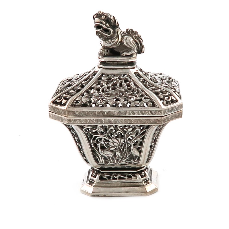 rectangular tapering form, pierced with foliate decoration, the pull-off cover with a Chinese Guardian lion finial, on a rectangular foot with canted corners, height 10cm, approx. weight 4.4oz.