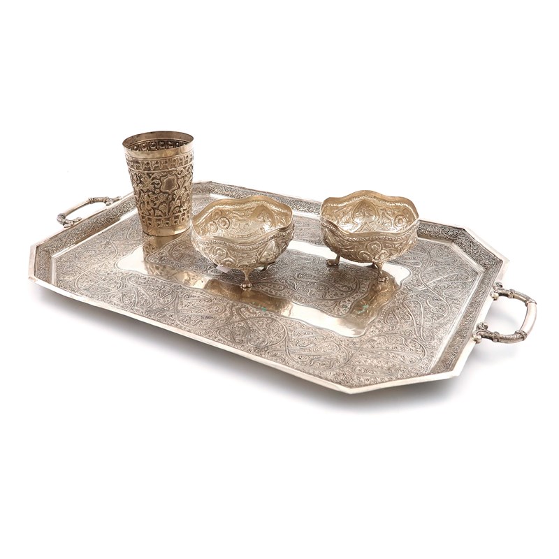 comprising: a two-handled tray of rectangular form, chased decoration, length handle to handle 46cm, plus a beaker of tapering circular form, chased foliate decoration, and a pair of bowls, on three paw feet. (4)