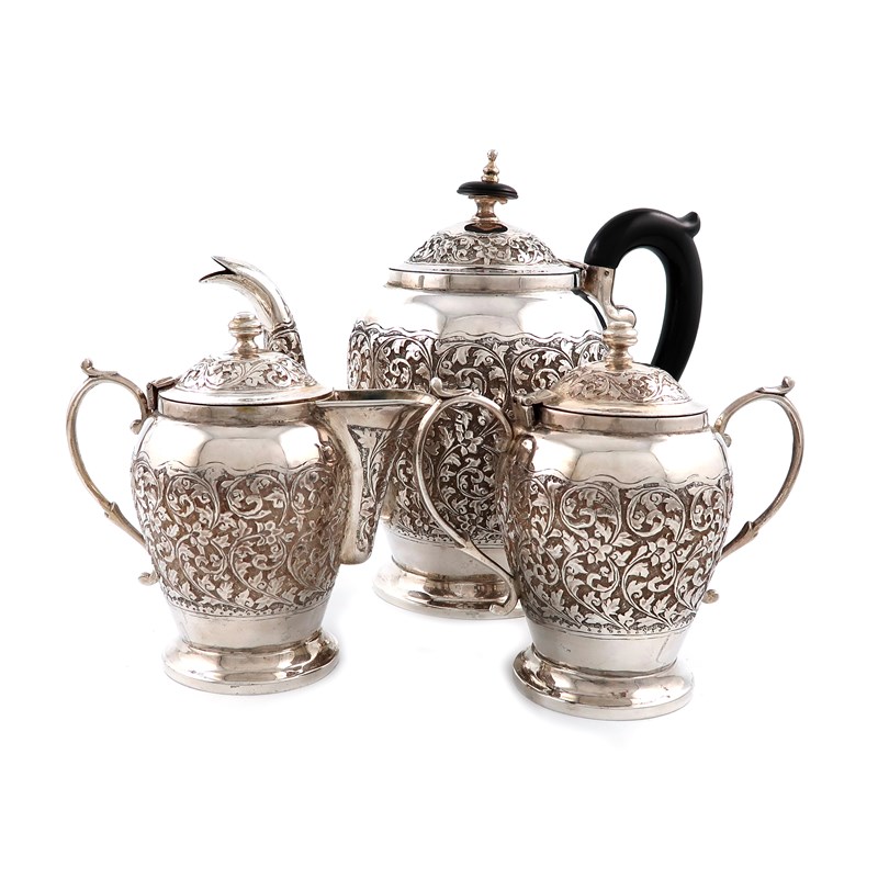 baluster form, chased foliate scroll decoration on a matted background, scroll handles, on circular bases, height of tea pot 19.5cm. (3)