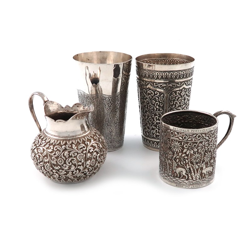 comprising: a Kashmiri goblet of tapering circular form, chased decoration, height 13cm, another beaker of tapering circular form, chased foliate scroll decoration on a matted background, inscribed, a jug, of baluster form, with similar decoration, scroll handle and wavy-edge border, and a Burmese mug, maker's mark of an elephant to underside of base, chased with elephants and animals, with a presentation inscription, approx. weight 23oz. (4)