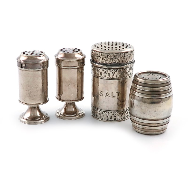 cylindrical form, on raised circular bases, plus a Colonial salt pot, of cylindrical form, foliate borders, titled 'SALT', pull-off pierced cover, and a late-Victorian silver pepper pot, by Charles Horner, Birmingham 1900, barrel form, approx. weight 6.7oz. (4)