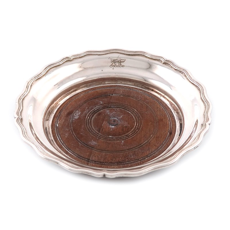 shallow circular form, moulded border, and engraved with a crest, wooden base, diameter 17.8cm.