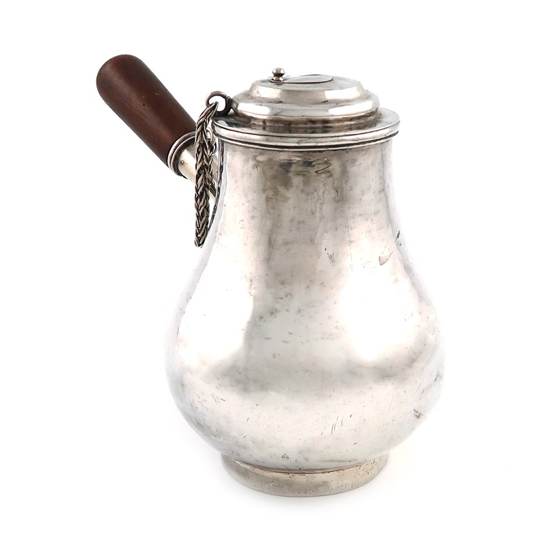 baluster form, the pull-off cover with a swing-action hinged cover for a molinet, with a chain attachment, turned wooden side handle, height 21cm, approx. weight 33.5oz.