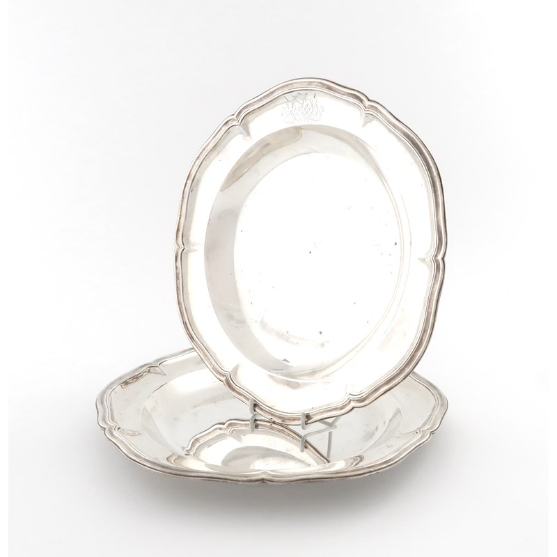 circular form, moulded border, engraved with armorials, diameter 29cm, approx. weight 43oz. (2)