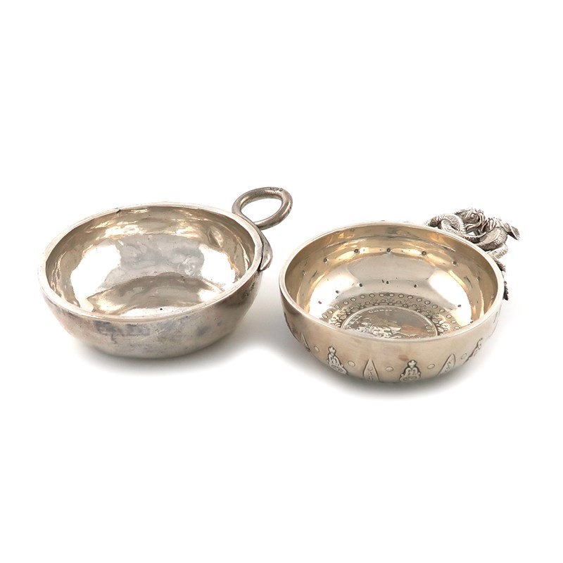 circular form, snake ring handle, inscribed 'J. BOURRIAN', length 12.4cm, plus a late 19th century French silver wine taster, circular form, the centre set with a commemorative medallion, with a bifurcated double mythical dolphin handle, length 12.3cm, approx. weight 10.8oz. (2)