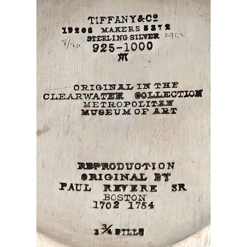 circular form, pierced side handle, inscribed 'Original in the Clearwater Collection Metropolitan Museum of Art.' and 'Reproduction, original by Paul Revere SR Boston 1702 1754 and '33/4 Gills', length 19.5cm, approx. weight 7.8oz.