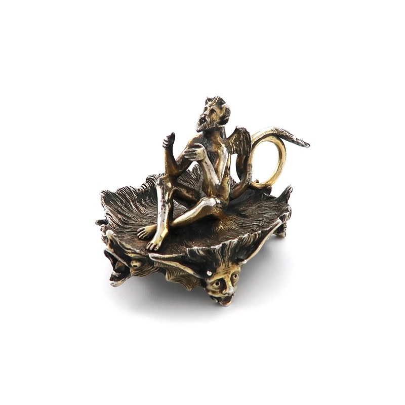 modelled as a seated devil with arms out to hold a candlestick, his tail forms the ring handle, the shaped base with flame decoration, the front with a grotesque mask, on three owl and winged devil mask feet, length 11cm, approx. weight 8.7oz.