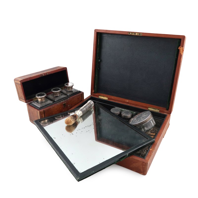 rectangular form, the screw-off covers with engraved decoration, in a fitted leather case, length 19cm, plus a silver part gentleman's travelling dressing set, by William Neal, London 1854, comprising: a shaving brush, and three silver-mounted toilet bottles, in a fitted leather case the interior of the hinged cover with a mirror, approx. weighable 3.5oz. (2)