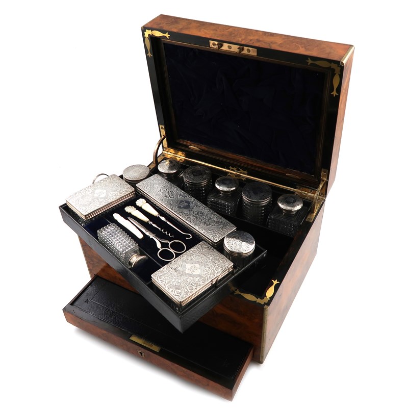 the covers with chased foliate scroll decoration, and with a monogram, hobnail cut-glass bodies, comprising: three scent bottles, a small scent bottle, three toilet boxes, three toilet jars, a replacement toilet jar and cover, also with a mother-of-pearl handled penknife, button hook and corkscrew and with a pair of scissors, in a fitted brass bound burr walnut case, the inside of the cover fitted with a mirror and stationary folder, the front with a pull-our drawer fitted for jewellery and with a writing slope, the cover with a monogram, length 32.3cm, height 20cm, approx. weighable 9.9oz.