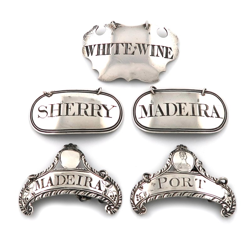 comprising: two George III examples by Hester Bateman, circa 1780, scroll form, gadroon borders, with pierced oval pediments, one crested, incised 'PORT' and 'MADEIRA', plus a pair of oblong form, reeded border, by Phipps and Robinson, London 1798/99, incised 'SHERRY' an 'MADEIRA', and one of cartouche form, by Richard Binley, incised 'WHITE WINE'. (5)