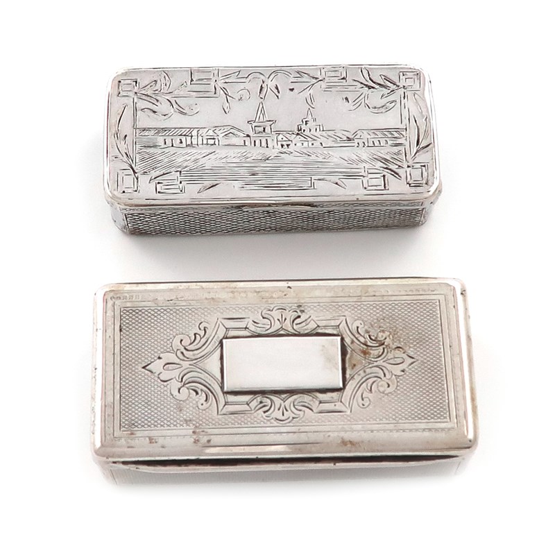 rectangular form, the hinged cover and base engraved with two scenes, plus a continental silver snuff box, probably Austro-Hungarian, rectangular form, engine-turned decoration, approx. total weight 3.9oz. (2)
