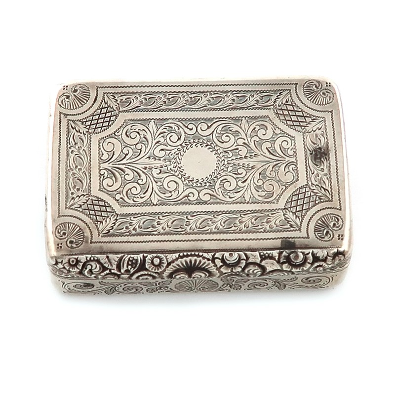 rectangular form, chased foliate scroll decoration, and with shell motifs, gilded interior, length 6.2cm, approx. weight 1.9oz.