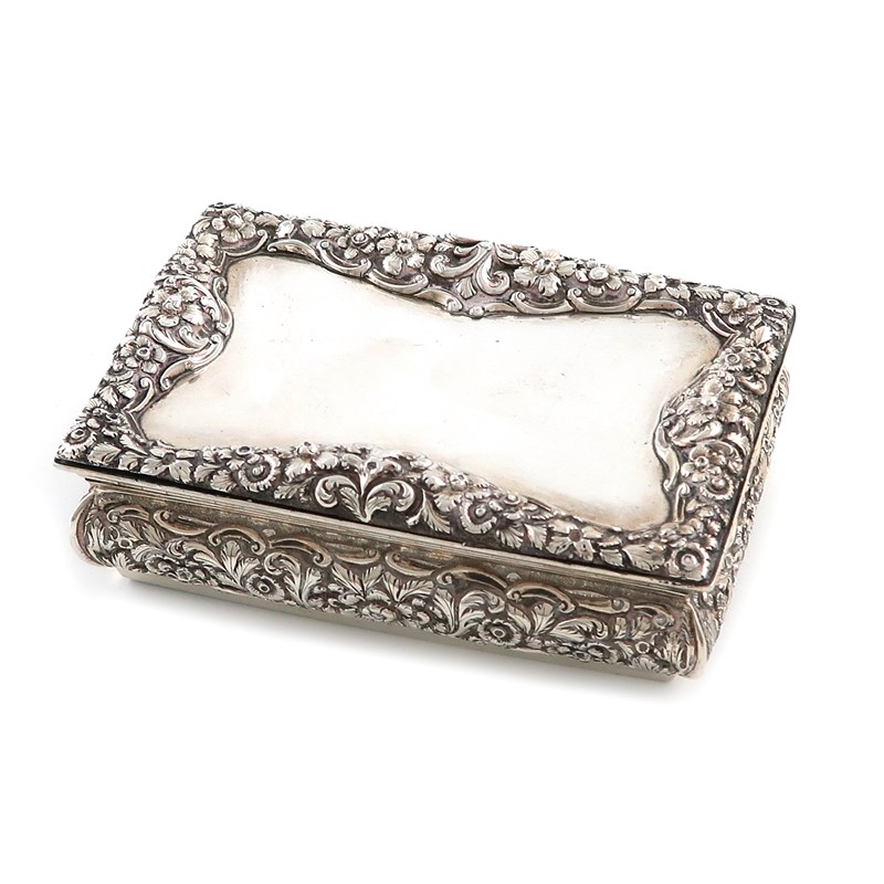 rectangular form, cushion sides, heavy foliate scroll decoration, gilded interior, length 10.5cm, approx. weight 8.3oz.