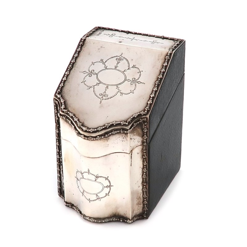 knife box form, the cover and front mounted with silver with engraved decoration and swag borders, green leather body, height 13.5cm.