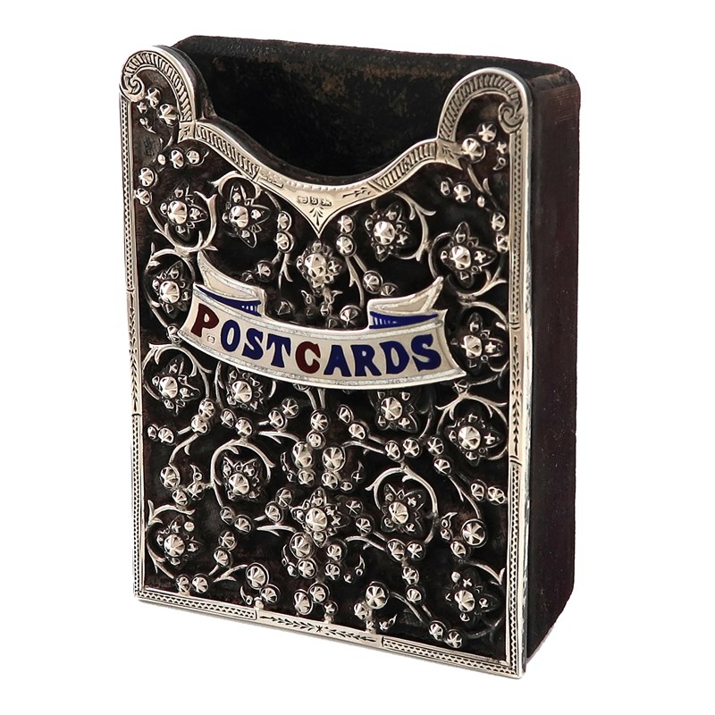 rectangular form, pierced foliate decoration, and applied in red and blue enamel 'POSTCARDS', velvet easel back, height 9.8cm.