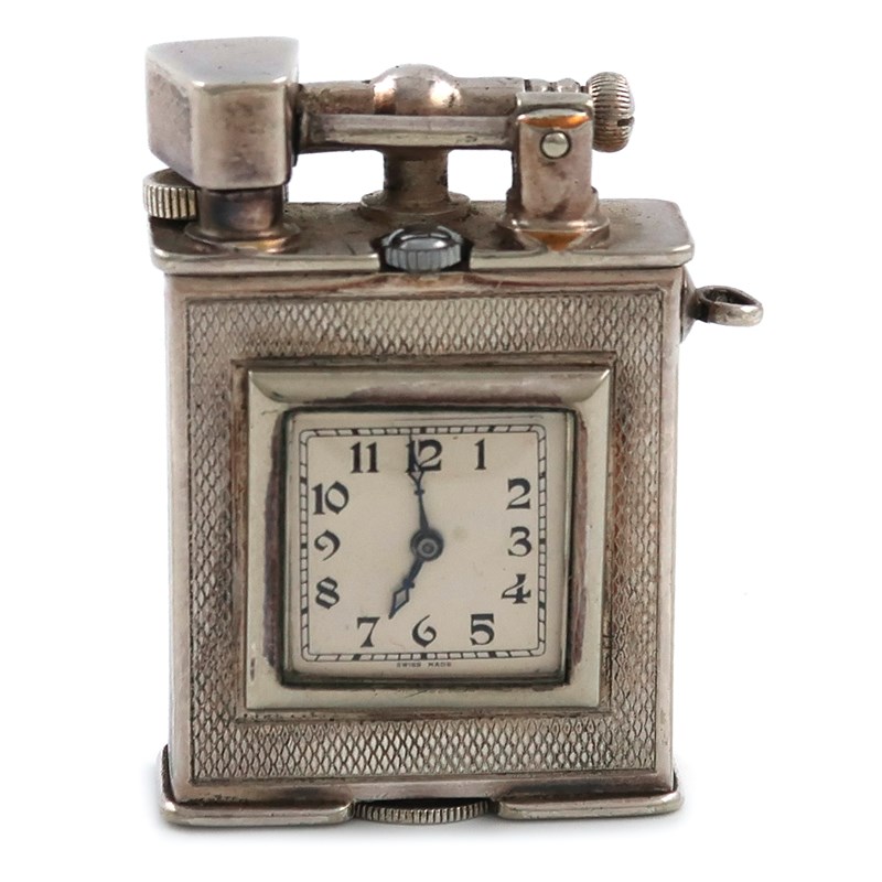 rectangular form, engine-turned decoration, the square dial, with 'Swiss made' in black, with a ring attachment, height 5.2cm.