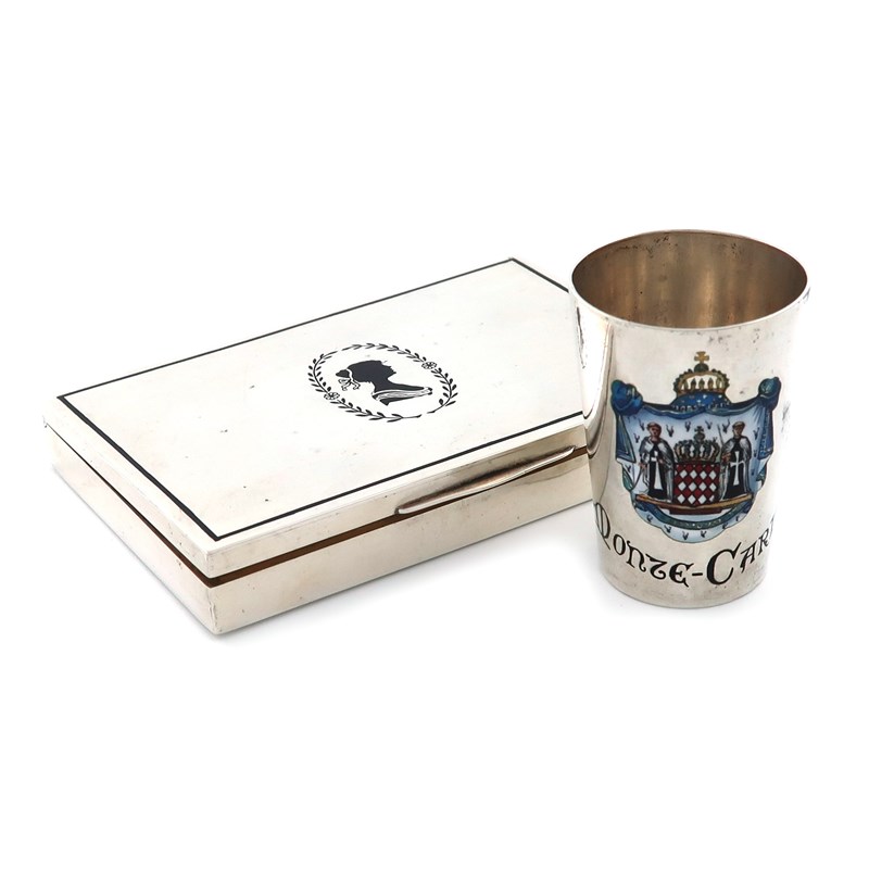 rectangular form, the hinged cover enamelled with a lady's head in a wreath surround, length 8.8cm, plus a German silver and enamel beaker, of tapering circular form, the front enamelled an armorial and 'Monte Carlo', approx. total weight 5oz. (2)