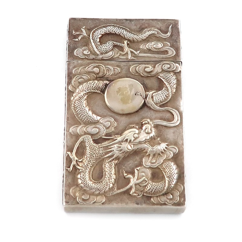 rectangular form, pull-off cover, the front embossed with a dragon, with a vacant cartouche, the reverse with bamboo and a bird, length 9cm, approx. weight 1.6oz.