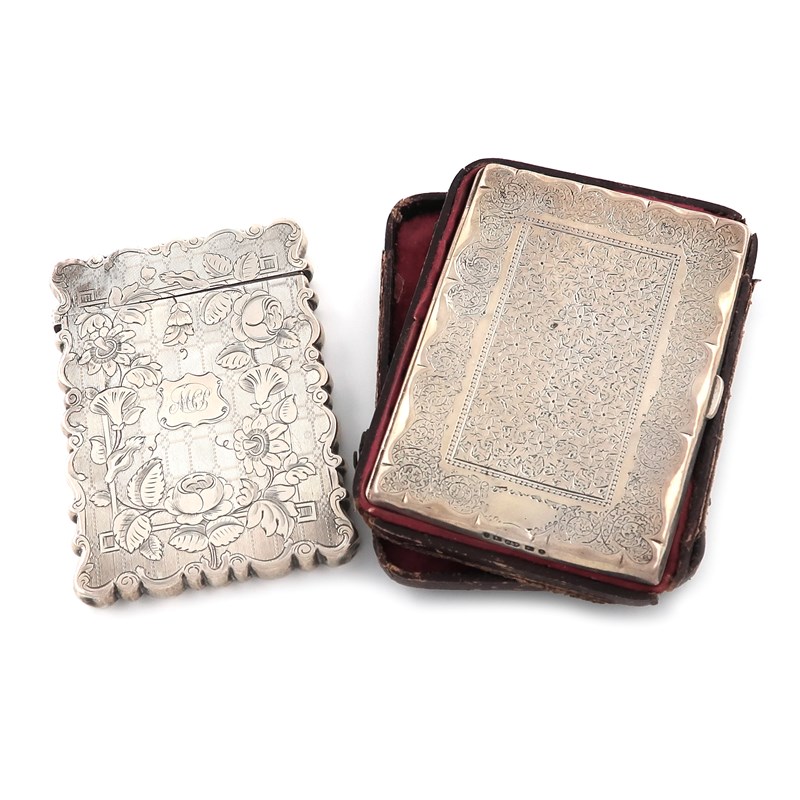 rectangular form, engraved foliate decoration on a matted background, length 9.7cm, plus a Victorian silver card case, by Deakin and Francis, Birmingham 1883, rectangular form, engraved decoration, silk lined interior, in a fitted case, length 9.7cm. (2)
