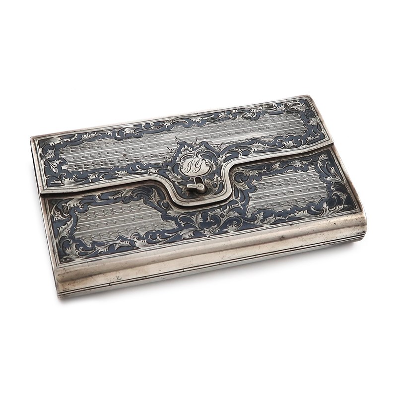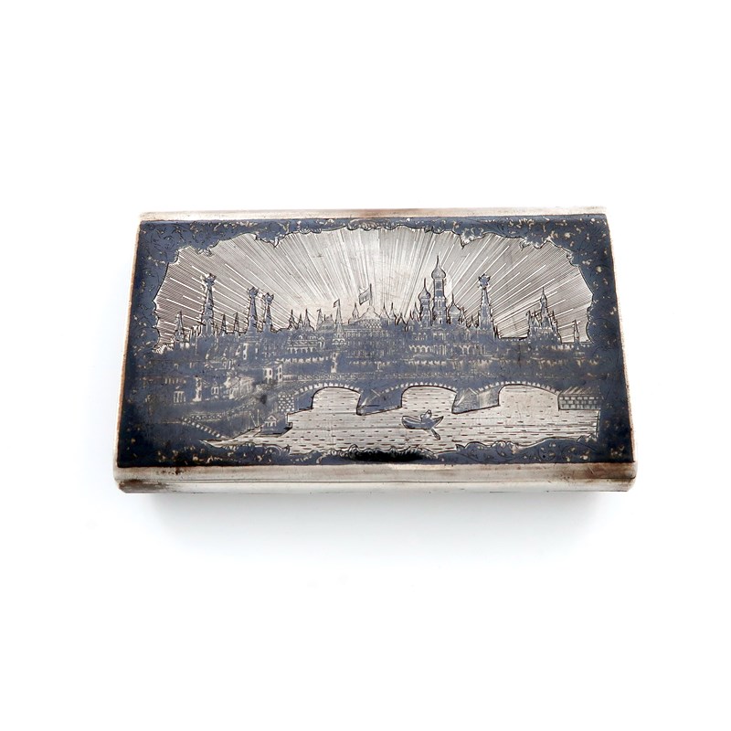 rounded rectangular purse form, with engine-turned and niello work foliate scroll decoration, the reverse with a niello scene of Moscow from the river, initialled, gilded interior, length 12.8cm, approx. weight 6oz.