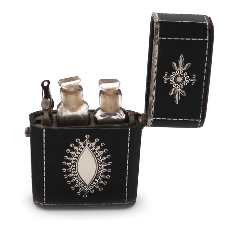 slight tapering rectangular form, canted corners, with inlaid silver bright-cut decoration, the interior with two scent bottles, a pair of tweezers, a toothpick / ear cleaner and a bodkin, height of case 5.5cm.