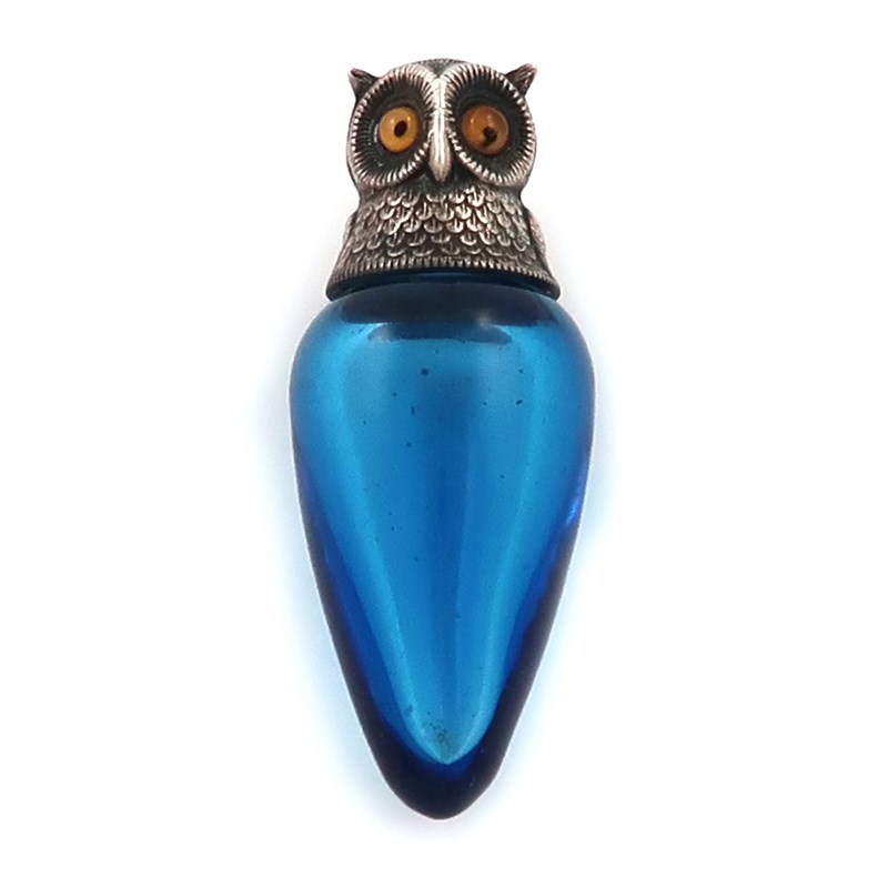 tapering blue glass body, the screw-off cover set with glass eyes and textured feather decoration, length 5.5cm.