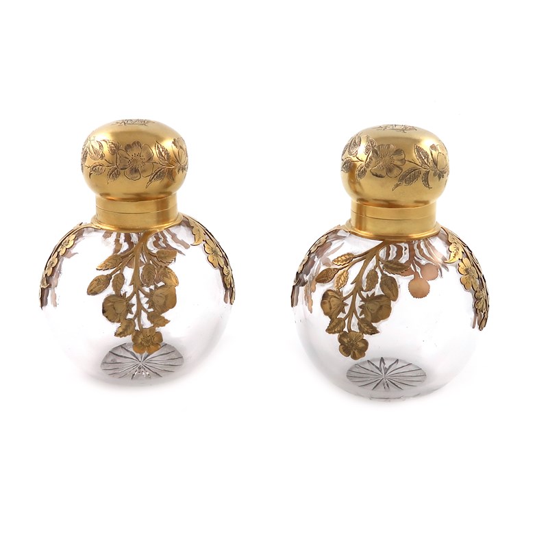 A pair of Victorian silver-gilt mounted glass scent bottles