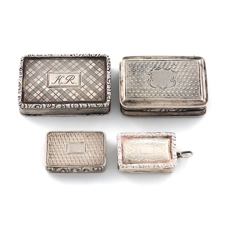 comprising: one by Francis Clark, Birmingham 1838, rectangular form, engraved tartan decoration, the cover with initials, foliate borders, the interior with a pierced and engraved silver-gilt grille, length 3.8cm, plus a Victorian one, by Nathaniel Mills, London 1845, engine-turned decoration, and two others with engraved and engine-turned decoration, approx. total weight 1.8oz. (4)