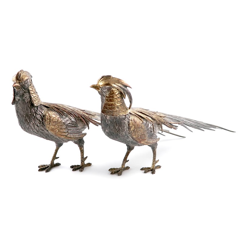 A pair of modern Spanish parcel-gilt silver pheasants,