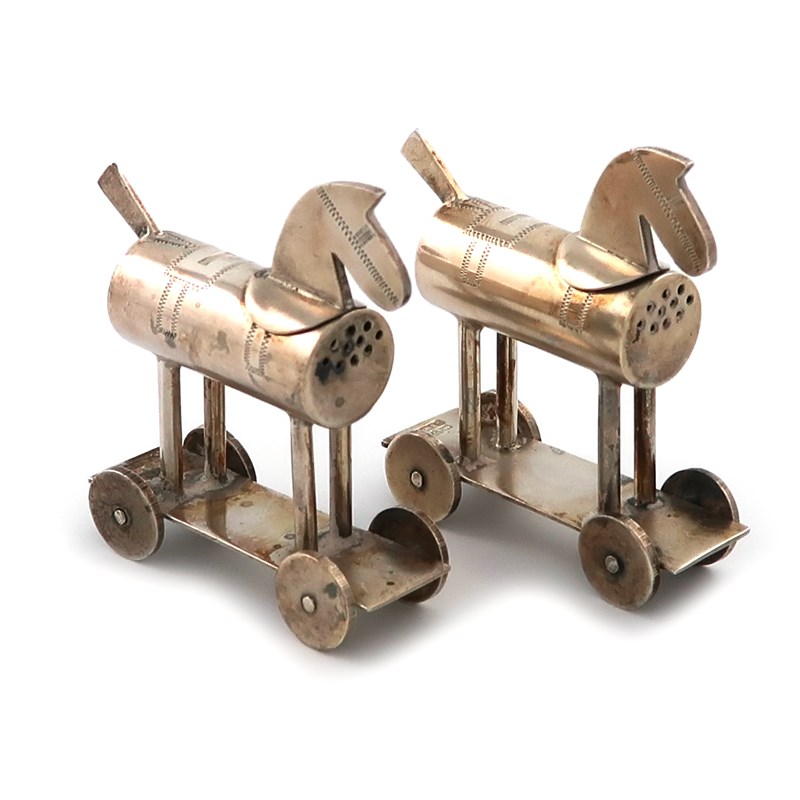 modelled as hobby horses, pull-off heads, on rectangular bases on four wheels, length 4.4cm, approx. weight 1.4oz. (2)