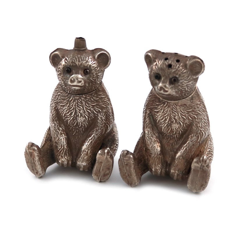 modelled in seated positions, the pull-off heads with silver eyes, textured fur, height 5.3cm, approx. weight 0.9oz. (2)