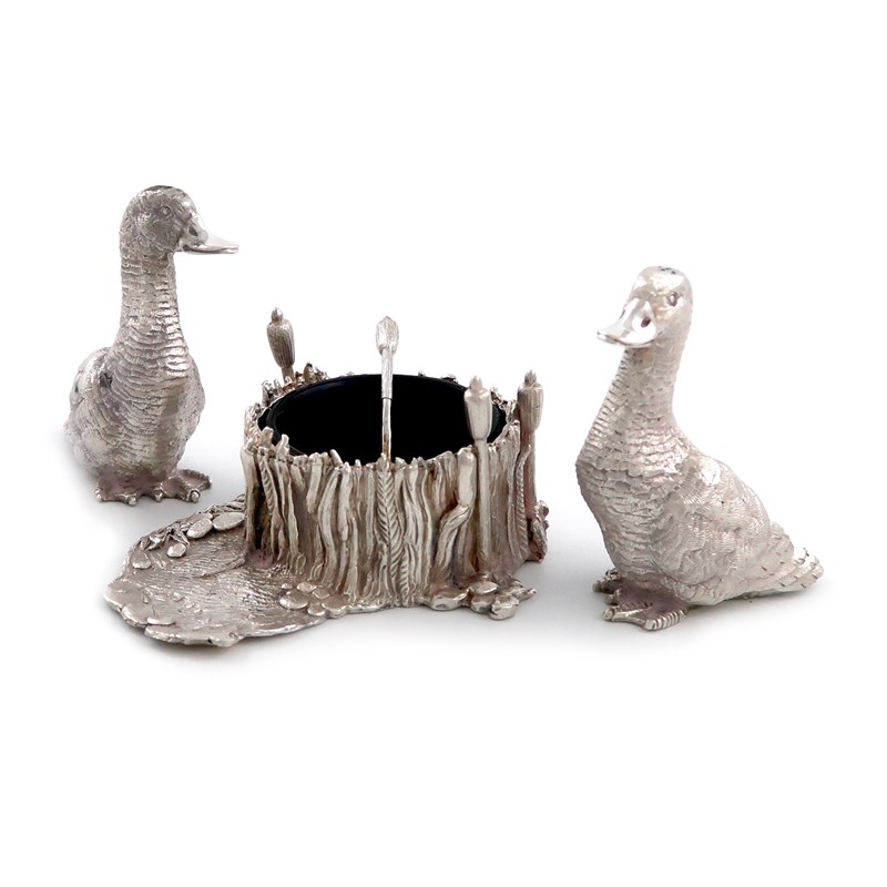the salt and pepper pots modelled as ducks, the salt cellar modelled as a pond with bull-rushes, lily pads and with a blue glass liner, also with a salt spoon with a bull-rush terminal, height 7.7cm, approx. weight 18.6oz. (4)