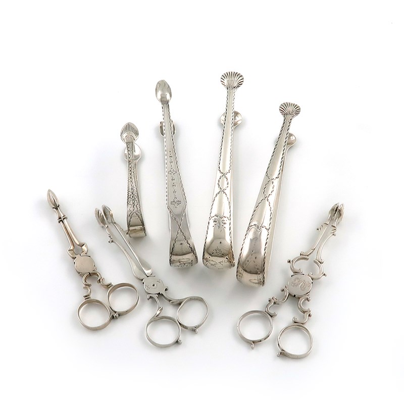 including an Irish provincial pair, by John Nicolson, Cork, circa 1790, the terminal with a crest, two pairs of Dublin Bright-cut tongs, a small London pair, and three pairs of 18th century London sugar nips, scissor form, ring handles, approx. total weight 7.4oz. (7)