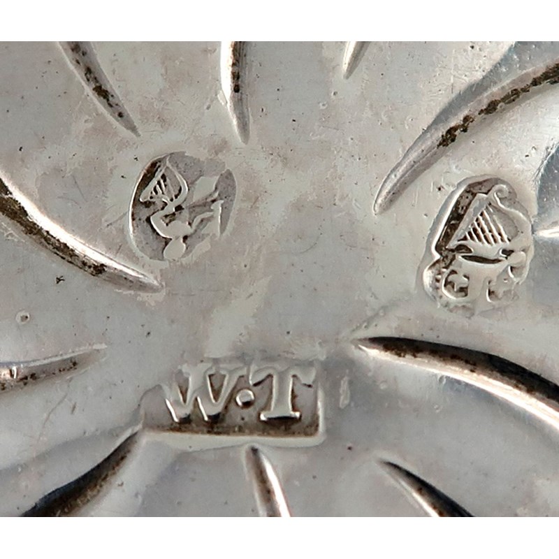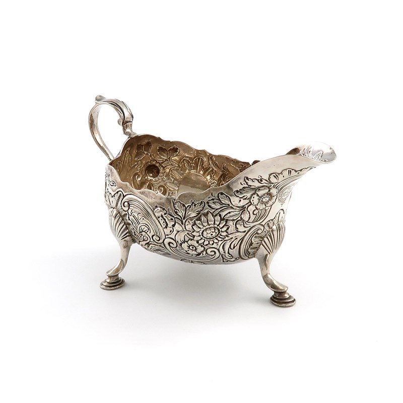 oval form, embossed foliate scroll decoration, leaf capped scroll handle, on three shell capped hoof feet, engraved with a crest, length 16.6cm, approx. weight 6.6oz.