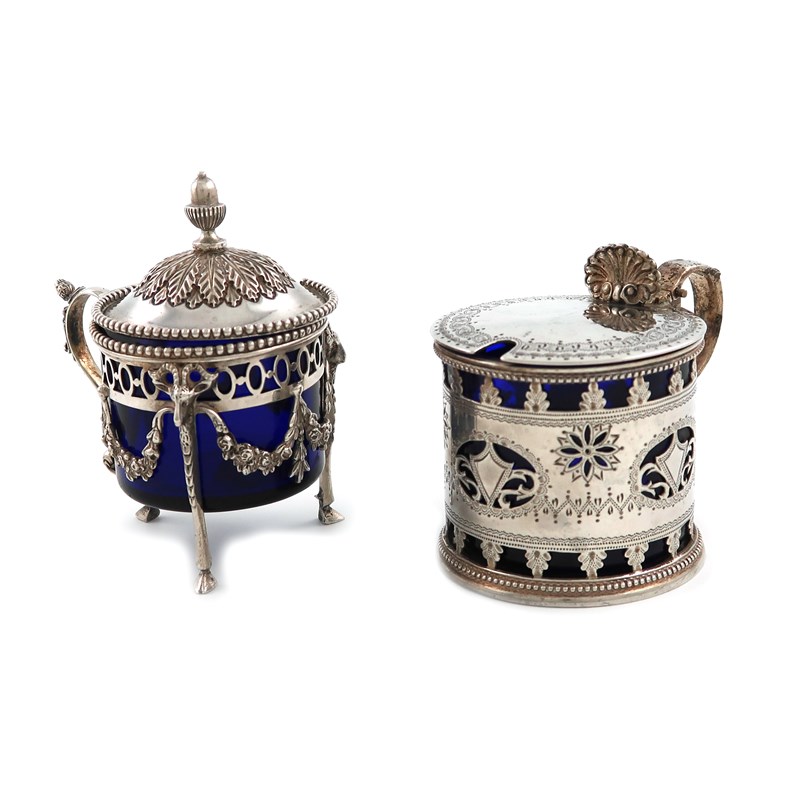 circular form, pierced and engraved decoration, scroll handle, with a blue glass liner, plus a French silver mustard pot of circular form, pierced decoration and with hanging swags, on three hoof feet, with a blue glass liner, approx. weight 4.8oz. (2)