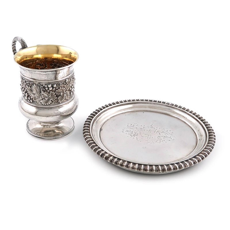 circular form, gadroon border, the centre with an armorial within foliate mantling, wooden underside, diameter 15cm, plus a George III silver mug, marks slightly worn, possibly by Joseph Angell, London 1816,